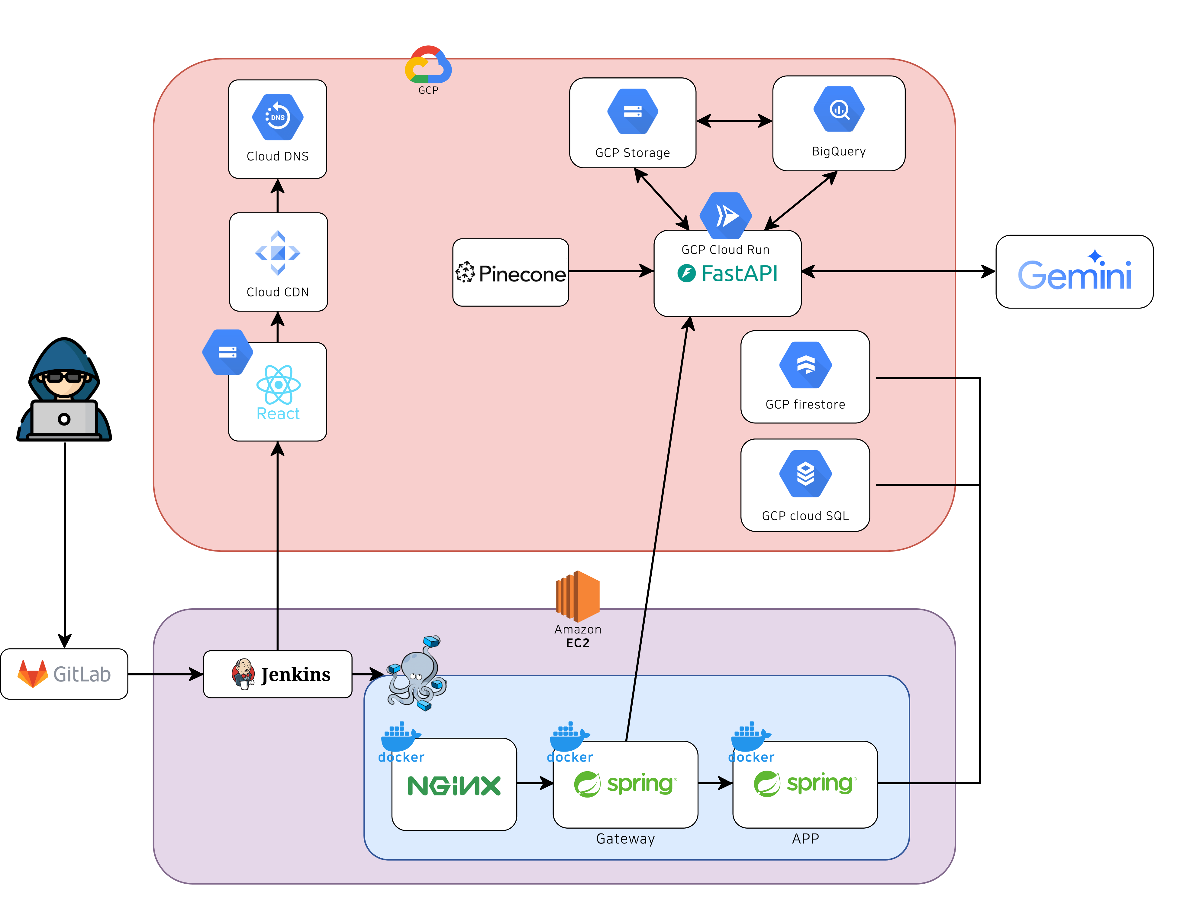 특히 AI 부분 코드는 Google Cloud Platform(GCP)의 Cloud Run을 통해 동적 배포되었다. Cloud Run은 컨테이너 이미지를 기반으로 서버를 자동으로 실행하는 서버리스 환경이다. 덕분에 서버 인프라(가상머신, 로드 밸런서, 스케일링 등)를 직접 관리할 필요가 없었다.