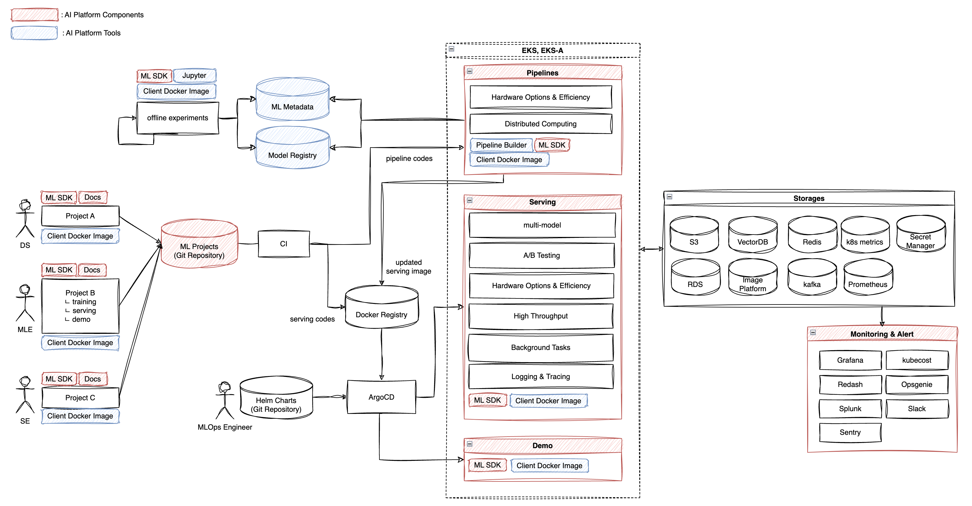 이러한 컴포넌트를 유기적으로 결합하여 쉽게 가져다 쓸 수 있게 만든 시스템이 바로 AI 플랫폼이다. 데이터 파이프라인, 모델 학습, 서빙, 모니터링 등 AI 개발과 운영의 전 과정을 통합해 개발자가 더 빠르고 안정적으로 AI 서비스를 제공할 수 있도록 돕는다.