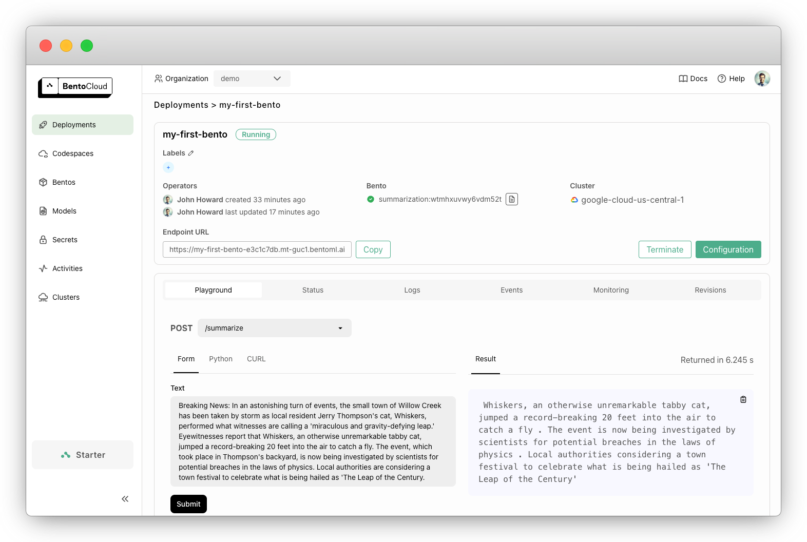 프로젝트 루트 디렉토리에서 BentoCloud에 deploy하기 위해선 다음의 코드를 실행하면 된다. 배포 단위의 이름은 원하는 대로 지어주면 된다. 아래 코드를 예시로 들자면 my-first-bento로 지은 셈이다.